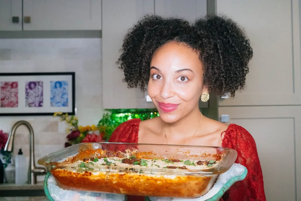 This recipe is really easy and quick! You just need a large pot to melt your vegan butter in, sauté your garlic, and cook your mushroom pepperonis. Then, get a glass baking pan and pop in some marina sauce and all your different kinds of cheeses! Bake them at 400F for 5-15 minutes.